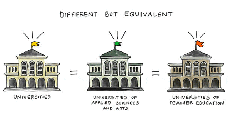 + Elvetia are 3 tipuri de universitati: echivalente, dar diferite totodata. In timp ce universitatile traditionale (University, 12 la numar) se concentreaza pe cercetare, universitatile de stiinte aplicative (University of Applied Sciences, 1 privata si alte 7 publice) si universitatile pedagogice (University of Teacher Education, 20 la numar) se focuseaza pe aplicarea in practica a cunostintelor acumulate.